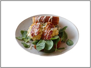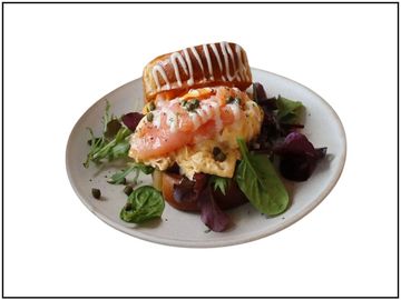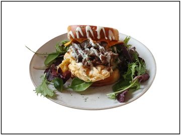 Egg Drop sandwich made with toasted brioche, specially cooked eggs, and a variety of toppings for a perfect harmony!